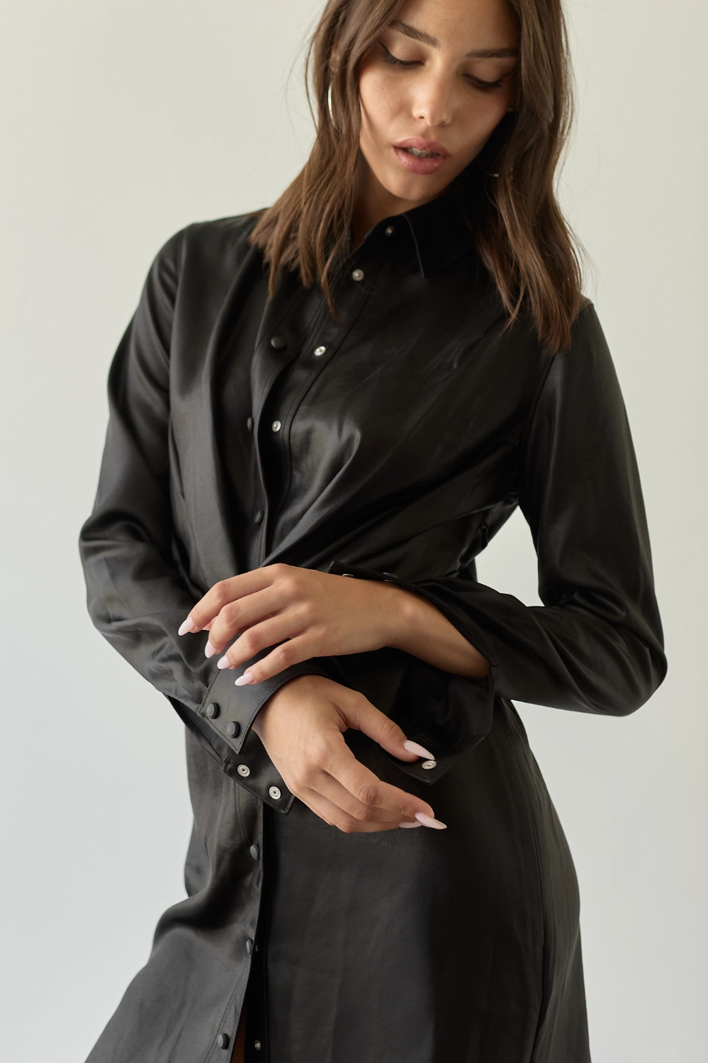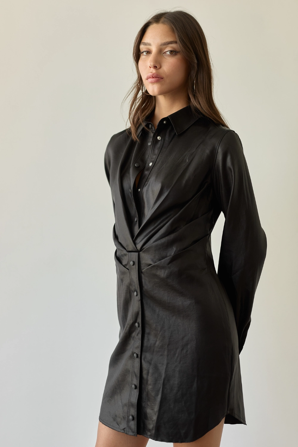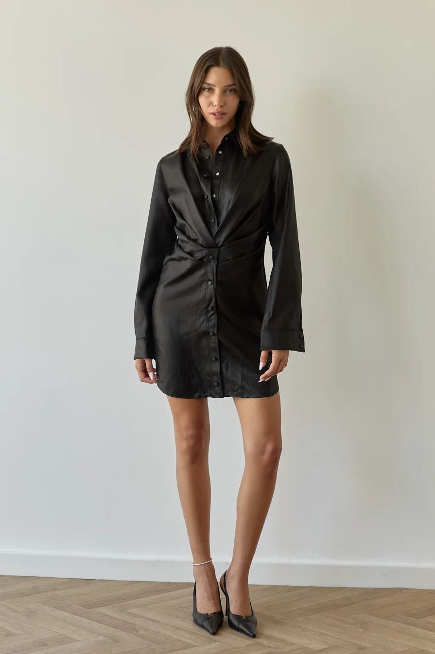 שמלה מיני בגזרה של חולצת גקט מכופתרת.כיווצים ומראה מעטפת סביב החזה והמותן להדגשת המותן שיוצרים מראה מחוייט ומחמיא.