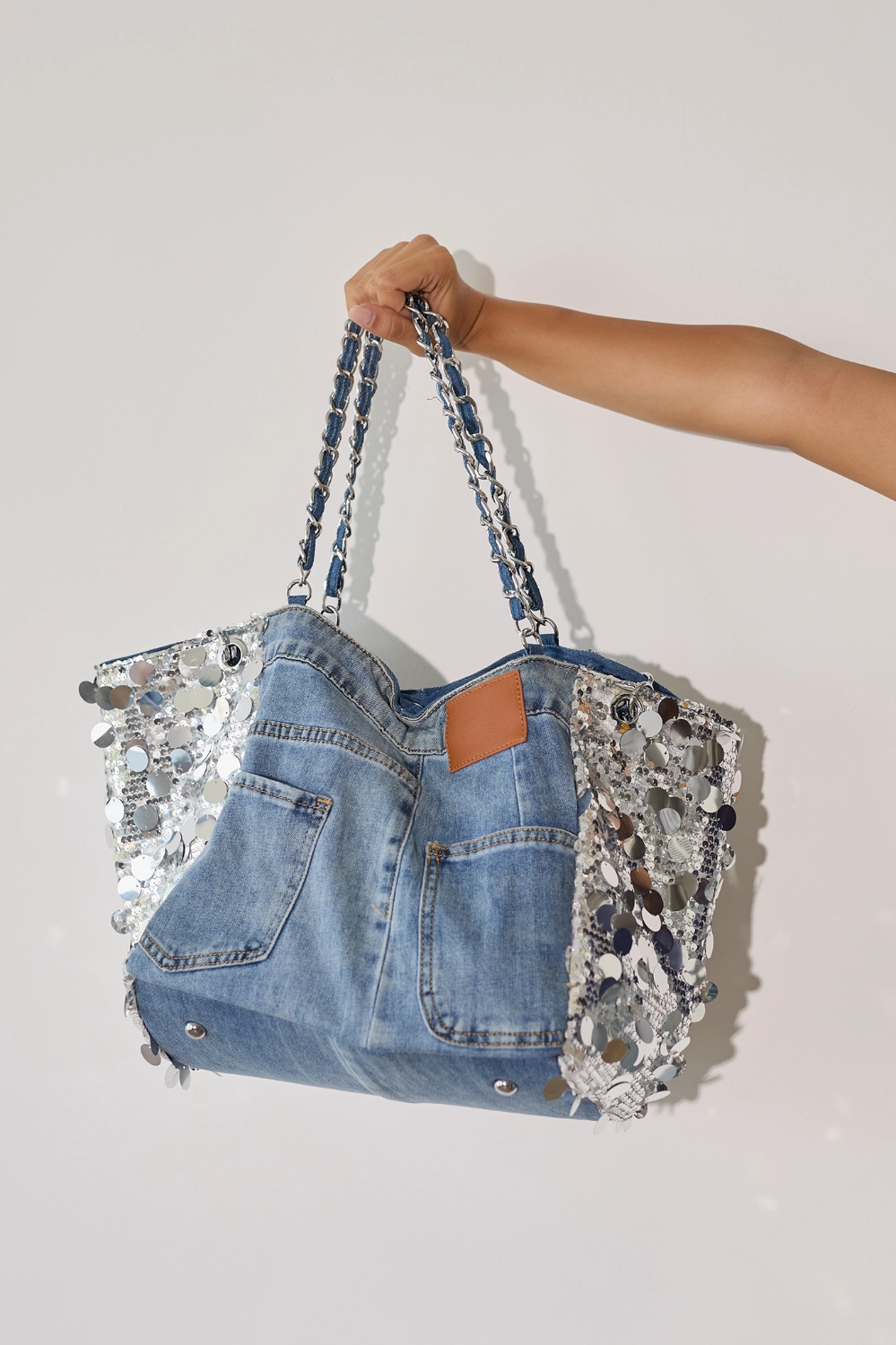 תיק ג'ינס עפ פאייטים כסופים בטנה פנימית כולל שרשראות כתף,ניתן לנשיאה ב-2 דרכים.סגירה מגנטית 4 כיסים חיצוניים55/26/13