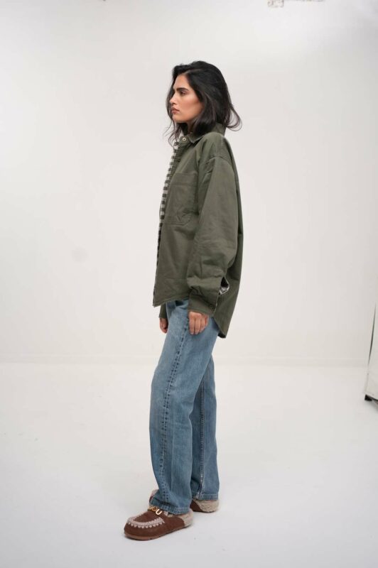 חולצה  משבצות אוברסייז ,דו צדדי  בצד אחד בצבע ירוק זית ובצד השני משבצות קטנות ירוק לבן.