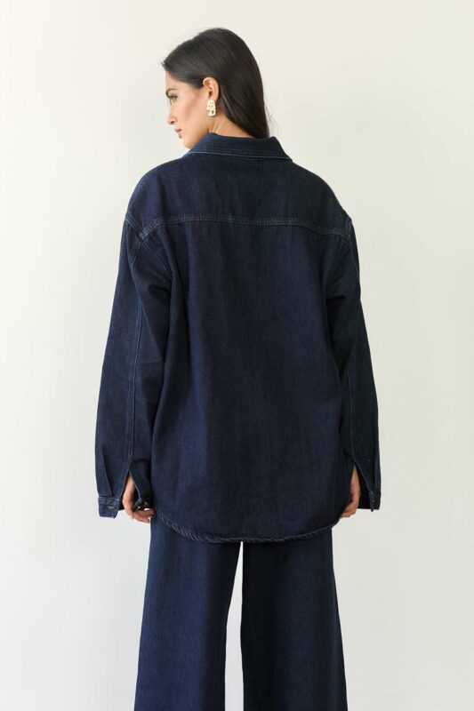 חולצה מבד ג'ינס בצבעים לבן וכחל כהה.