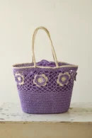 תיק סל בוהו שיק קרושה בסריגה ידנית סגול שמנת מעוטר בפרחים סרוגים בחלקו העליון30/37,כולל שק תואם לצבע התיק נשרך.
