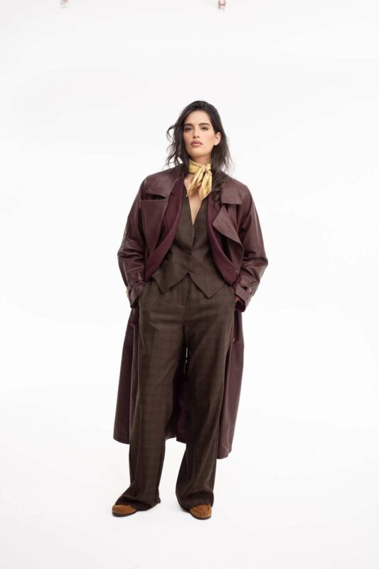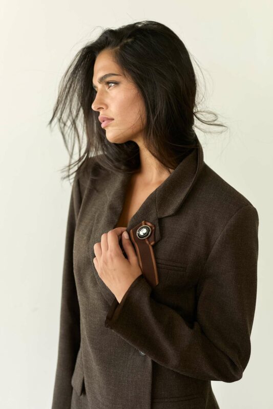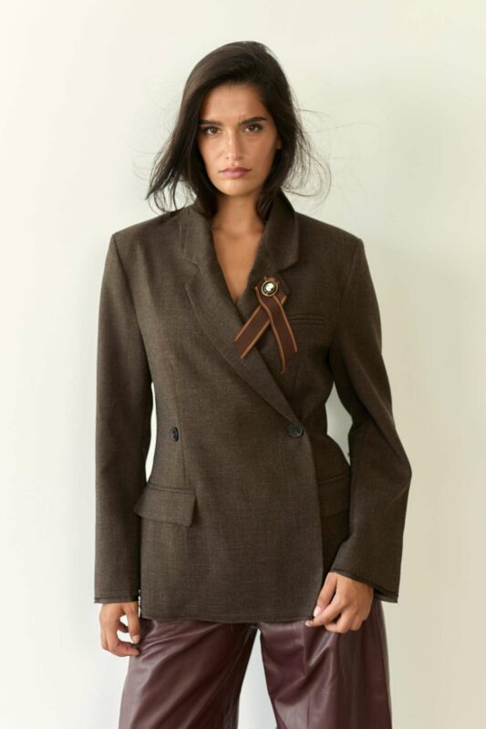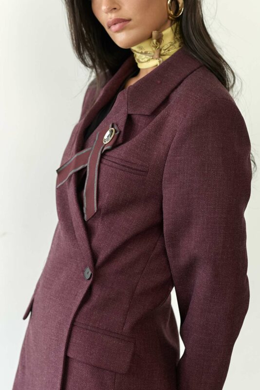 לג'קט רכיסה דאבל כפתורים כפולים להבלטת המותן, צווארון דש מחודדים עם סיכה שניתן להוריד וכיסים בצידי הג'קט.